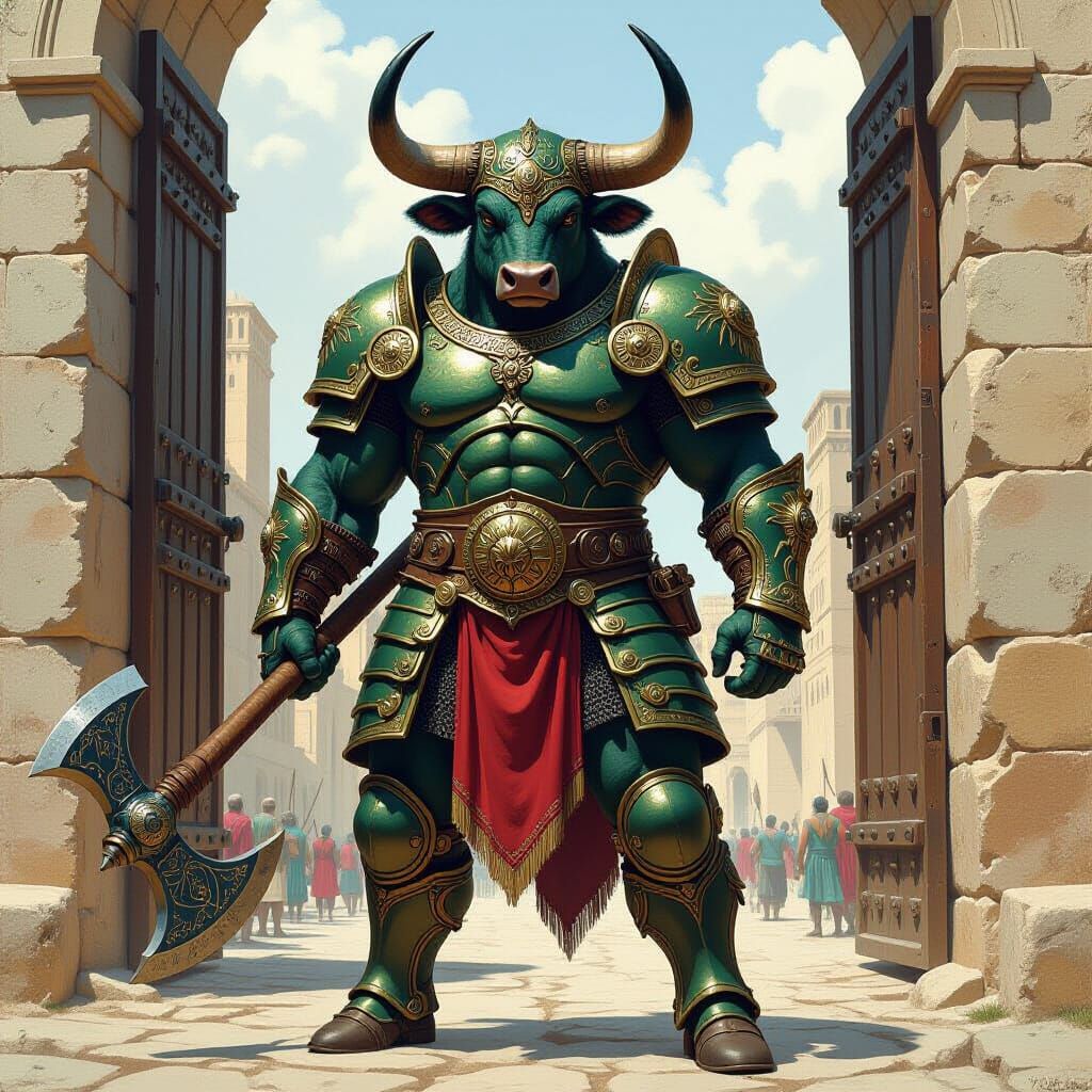 This image shows an anthropomorphic bull warrior at a city gate. The bull is clad in bronze armor and wields a battle ax, rendered with dynamic fantasy art and atmospheric lighting.