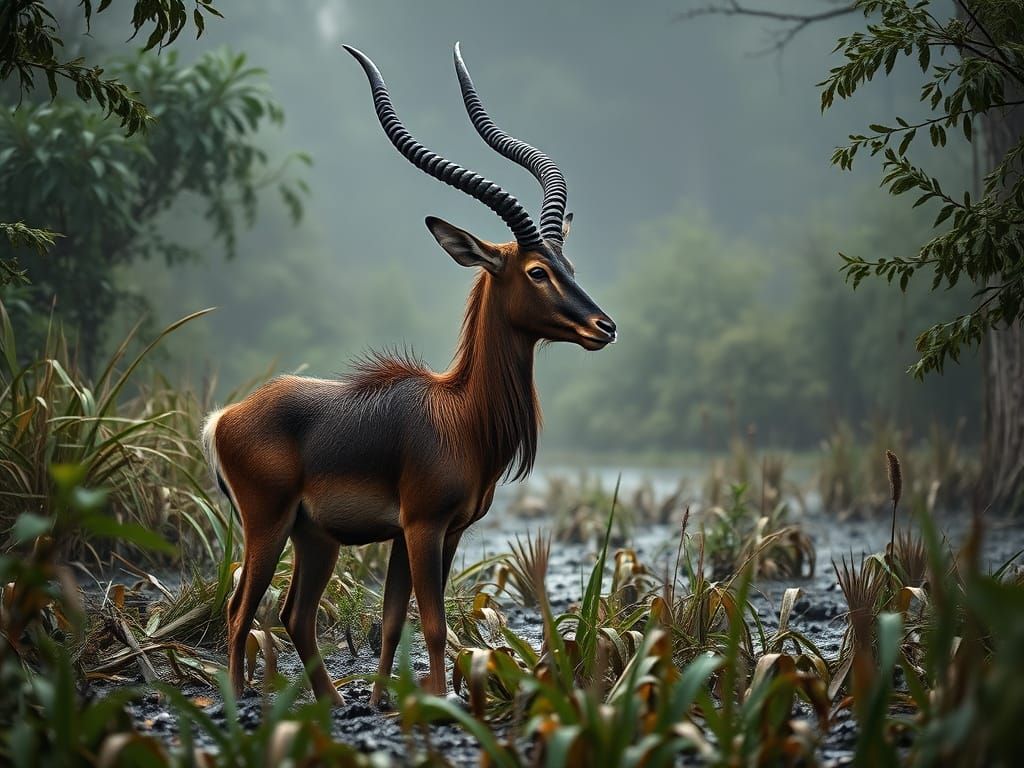 This image shows a Sitatunga antelope with shaggy fur and spiraled horns in a dense, misty swamp. Captured with HDR and cinematic lighting for hyperrealistic detail and sharp focus.