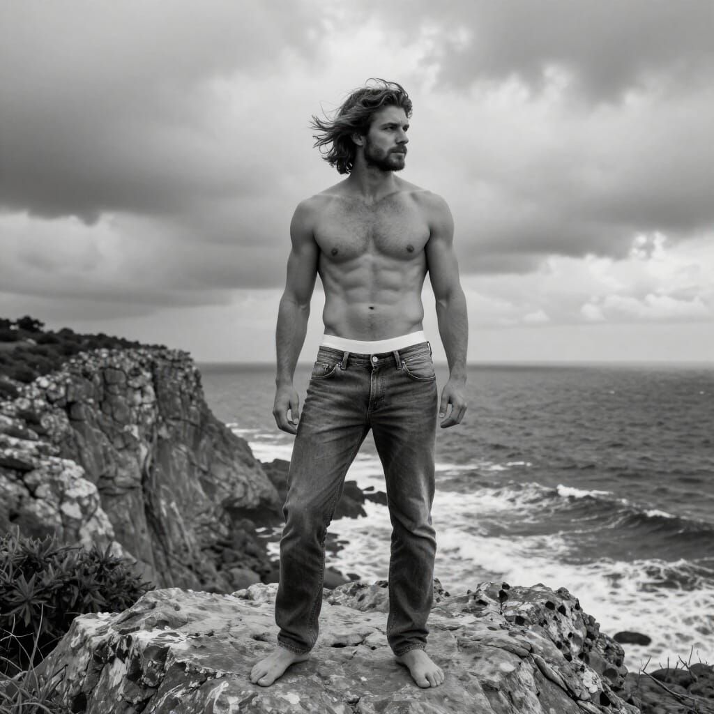 This striking black and white photograph features a muscular man with wavy brown hair standing on a rocky mesa. Dramatic stormy skies and rough seas create a powerful, windswept scene.