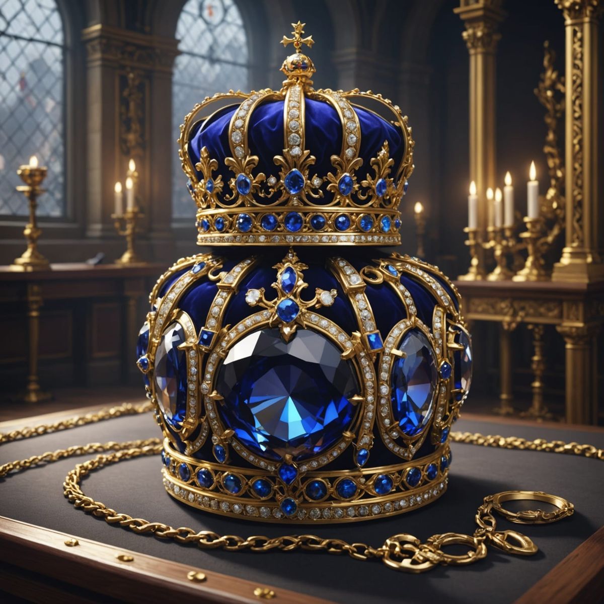 This 3D anime art depicts a daring heist of priceless crown jewels, rendered with breathtaking detail and vibrant aesthetics.