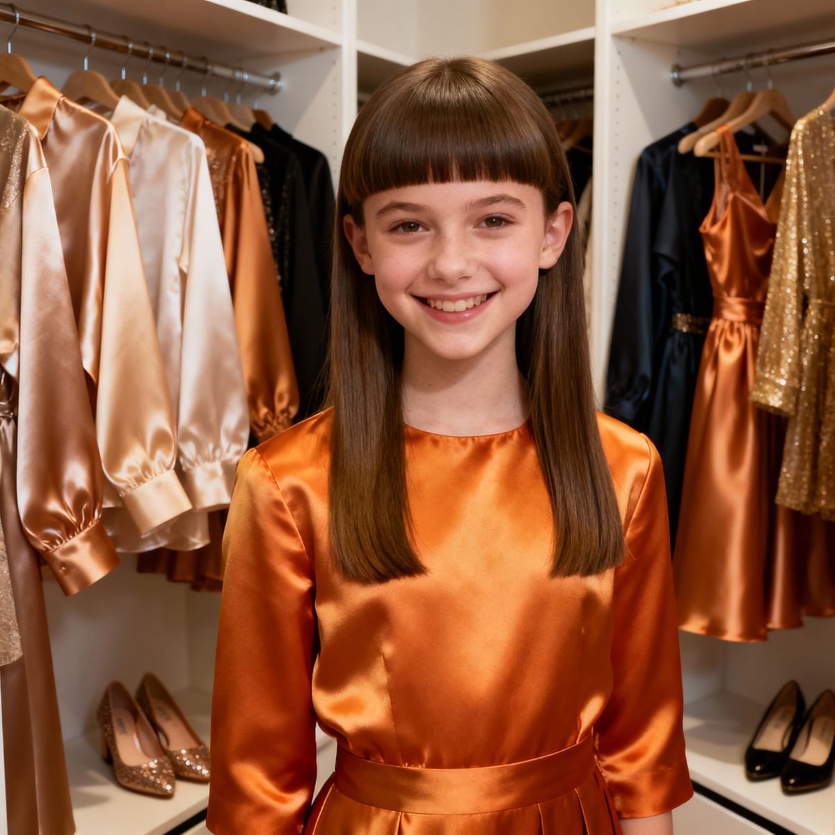 A 15-year-old French girl with a brown bob haircut smiles, posing in her favorite orange satin dress and shoes within a closet filled with satin garments.