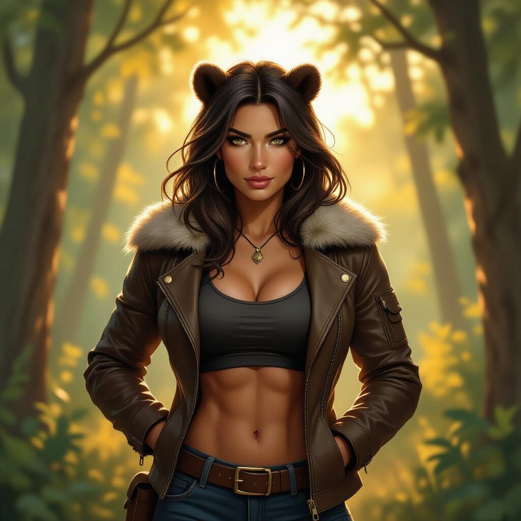 This image shows a strong woman with subtle bear-like traits in a sun-dappled forest during golden hour. Rendered in a fantasy realism concept art style with painterly textures.