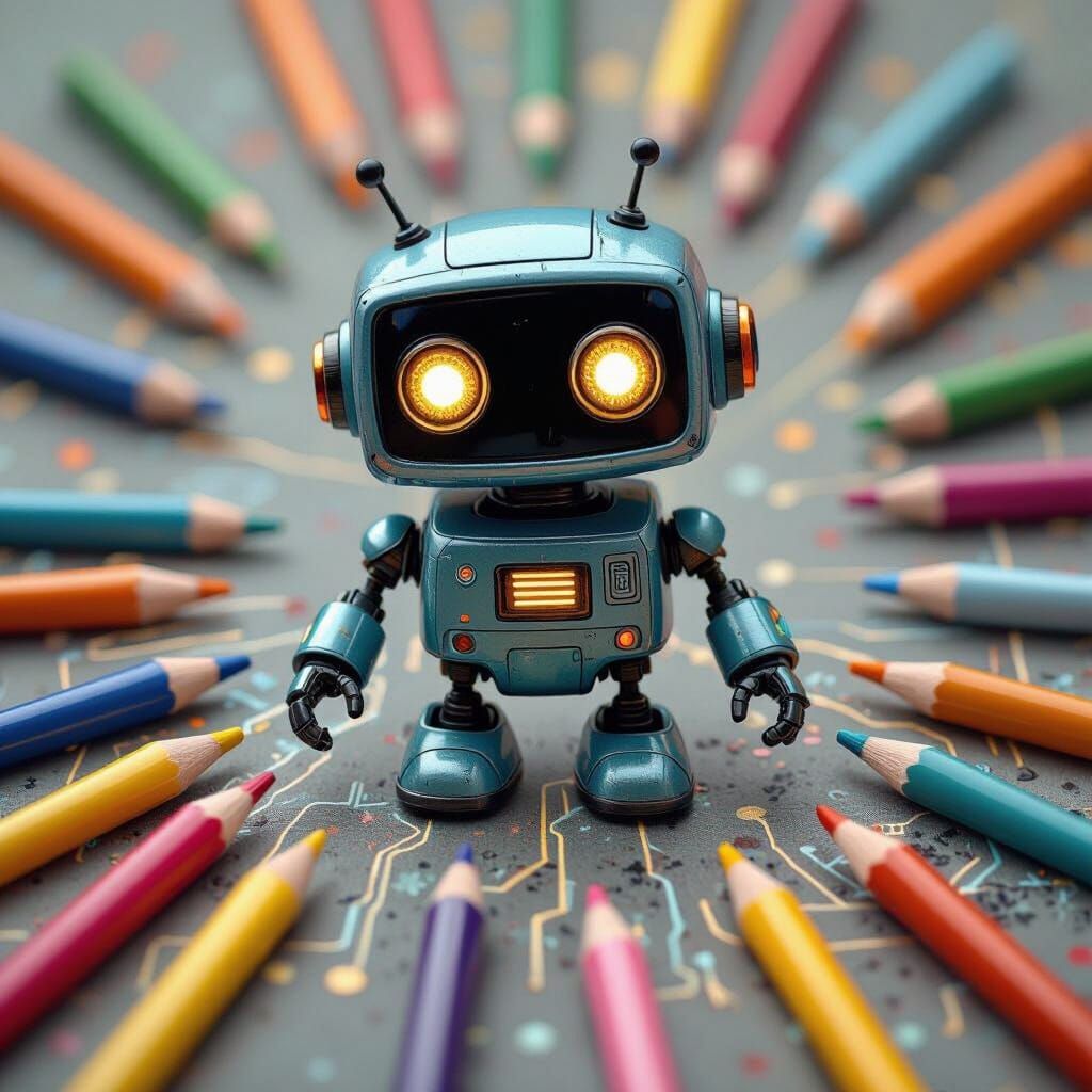 This image shows a cute little robot with bright eyes surrounded by futuristic elements. The robot is half-colored with vibrant crayons, in a playful, childlike style full of textures and patterns.