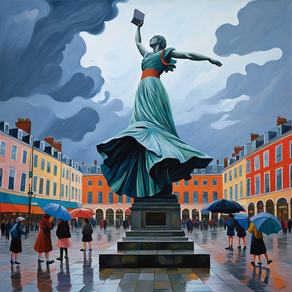 This image shows a giant marble statue of a woman in a windy, rainy European city square. People are sheltering under the statue's flowing skirt in this acrylic painting.