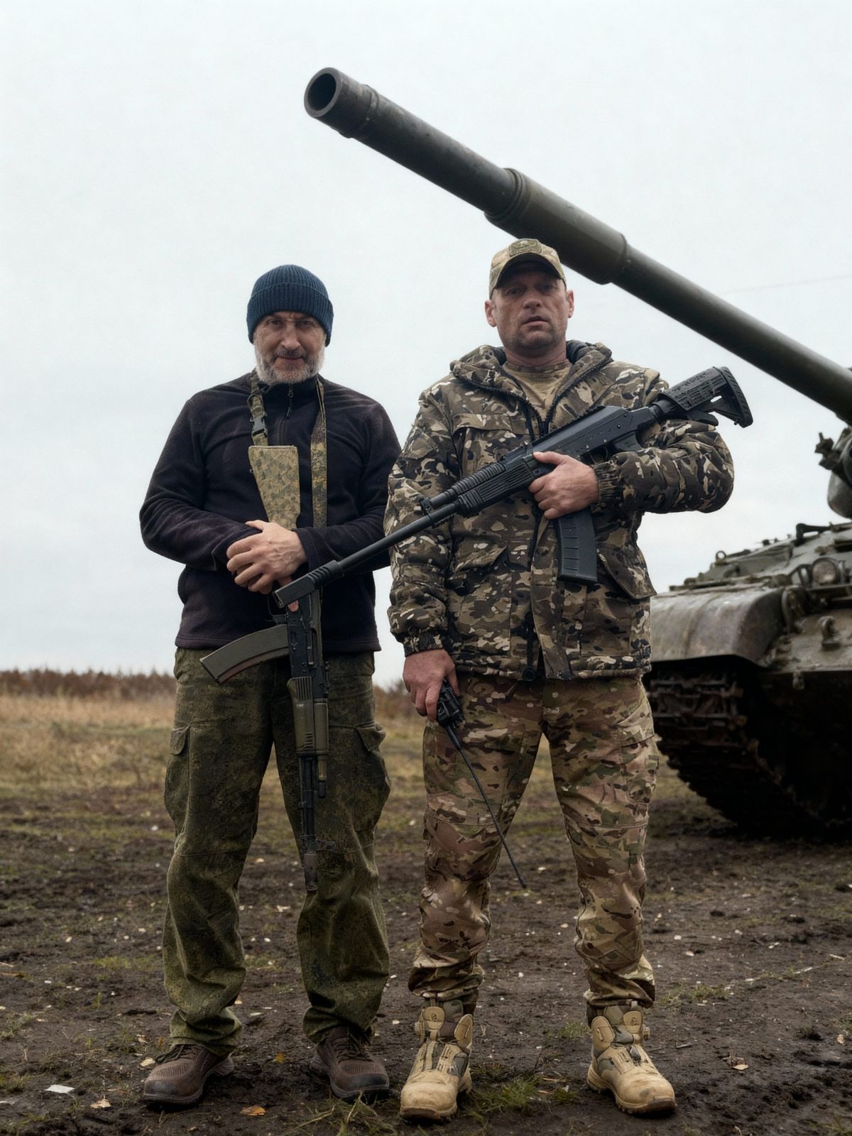 This image shows two men in military uniforms standing beside a tank. The scene is depicted in a gritty, photorealistic style with a muted color palette, capturing the atmosphere of a cloudy day with volumetric lighting.