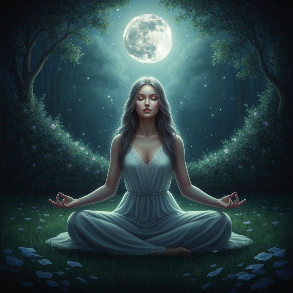 A beautiful vampire finds inner peace meditating in a lush garden under soft moonlight. Rendered in a rich, painterly style with intricate detail and a dreamlike mood.