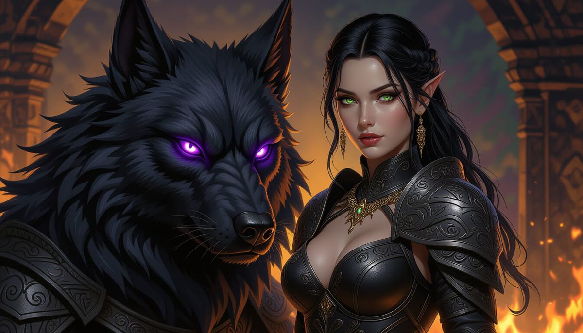 This image shows a woman with black hair and emerald eyes beside a hellhound. The composition blends art nouveau elegance with dark fantasy elements, featuring dynamic lighting and a purple and yellow color palette.