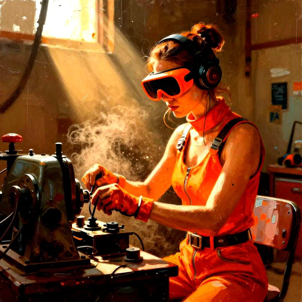 This image shows a woman in a retrofuturistic setting, rendered with an impasto grunge aesthetic in vibrant orange tones, evoking a vintage solar work theme.