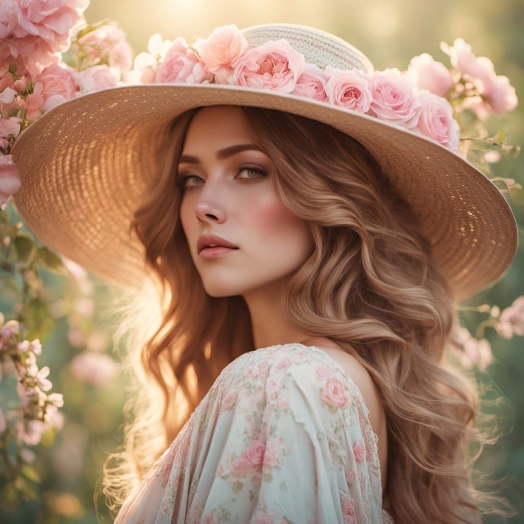This digital painting depicts a young woman with flower-adorned hair wearing a straw hat. She holds a bouquet, bathed in warm, gentle sunlight, with intricate, romantic details.