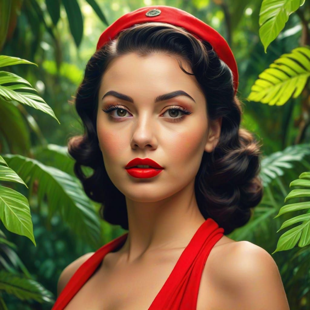 A vibrant pop art portrait of a pin-up girl in bold red, set amidst lush greenery and warm lighting, evoking a nostalgic retro feel