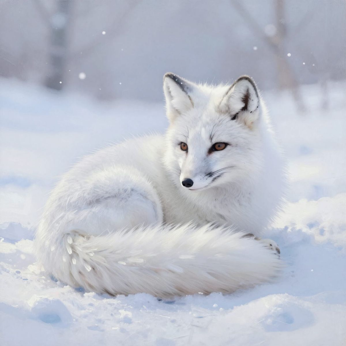 This image showcases an impressionist painting of a serene arctic fox nestled in soft snow. It features loose brushstrokes and cool pastel tones, capturing a quiet winter mood.