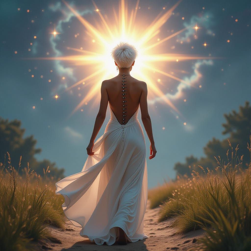 This illustration depicts a warrior woman with white pixie hair and a flowing backless dress, looking over her shoulder. The artwork features cosmic, astral, and holographic elements.