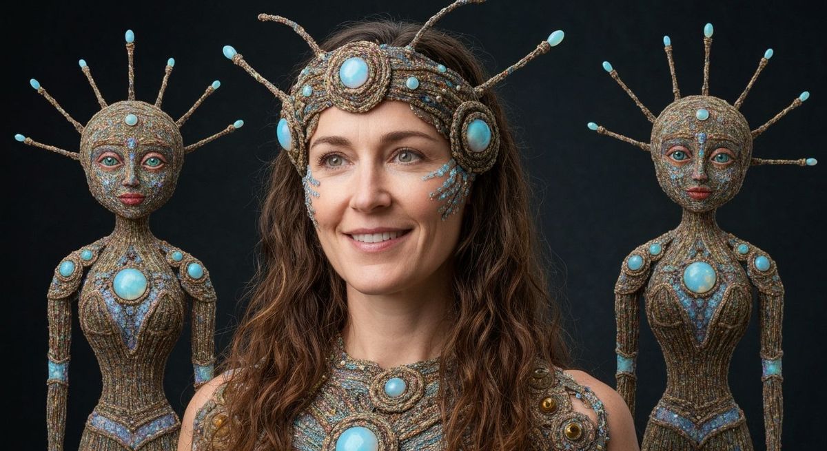 A hyper-realistic, highly detailed image of a woman created from salvaged parts, with liquid opal eyes. Woven from light and memories, she embodies elemental waveforms and the pulse of human emotion.