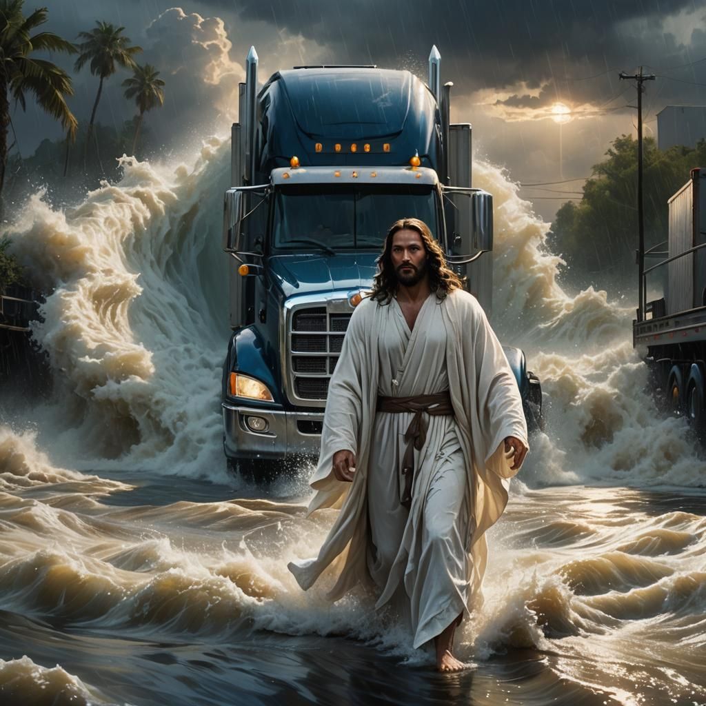 A striking picture of Jesus Christ leading a semi-truck through a flooded road. The scene is illuminated by golden light, contrasting with the cool blue floodwaters in a fantastical style.