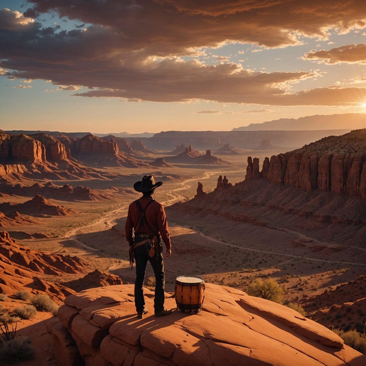 This image shows a lone cowboy on a red canyon rock in the Arizona desert at sunset. Dramatic clouds and warm orange dust create a cinematic Western atmosphere with long shadows.