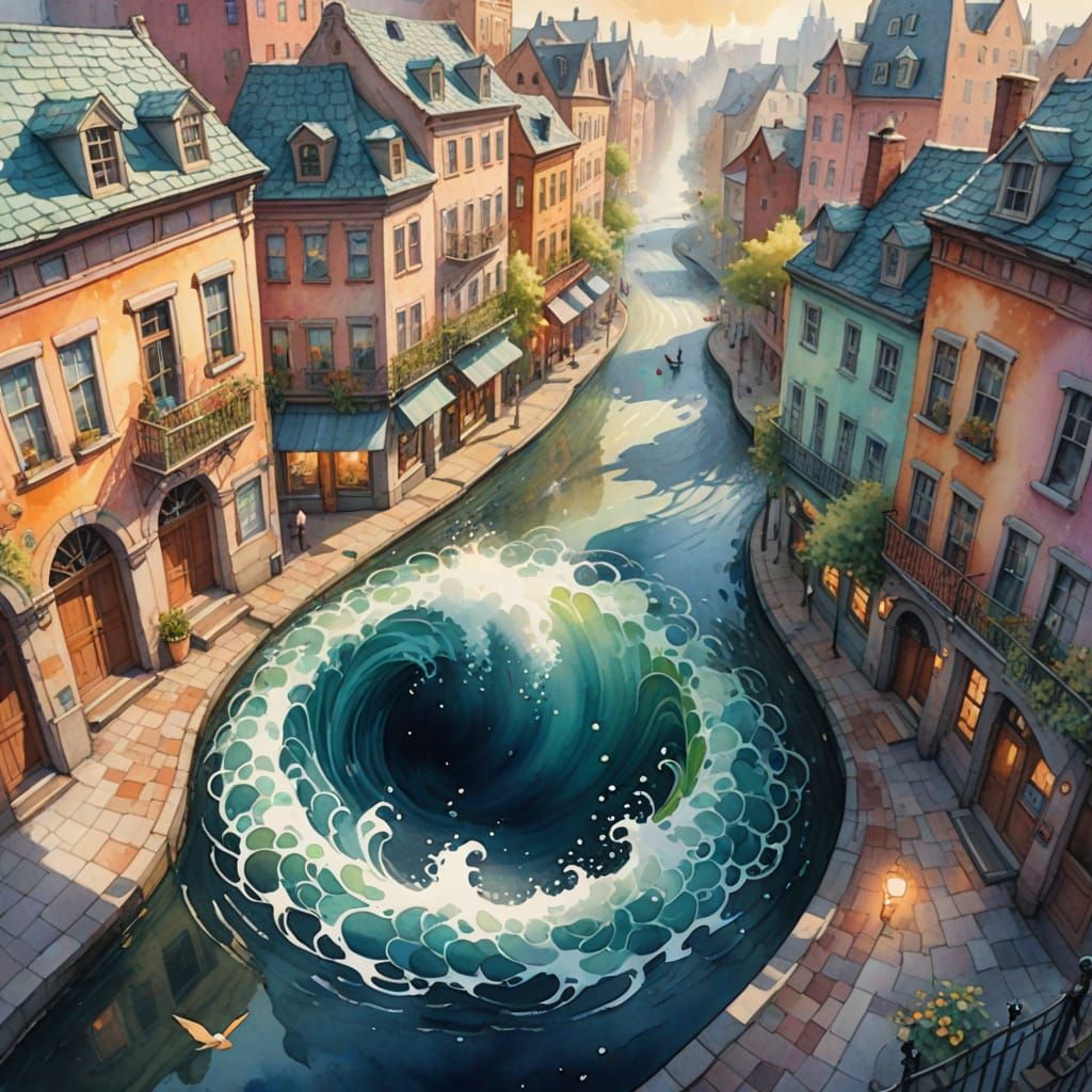 This watercolor storybook illustration depicts a whimsical, swirling water portal on a city street, rendered with soft pastel colors and dreamy, ethereal details.