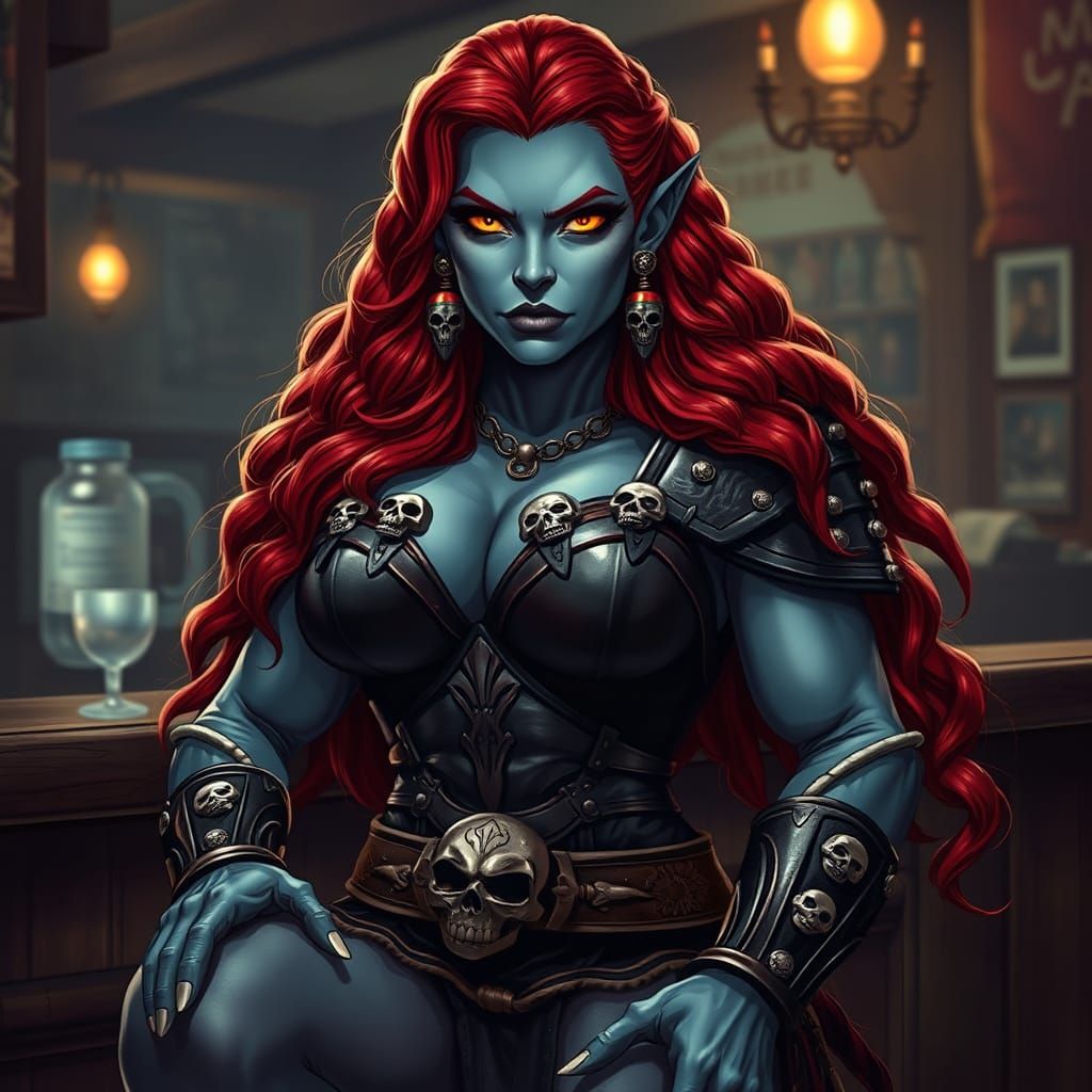 This photorealistic image shows a muscular female ogress with long red hair and glowing golden eyes, wearing skull-adorned Spartan armor while sitting at a bar in a tavern.