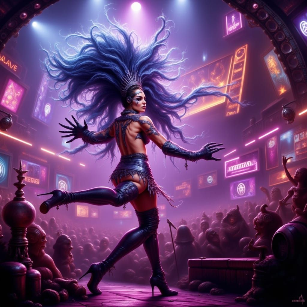 <lora:Alchemie Wizard:1.0> <lora:Flux Romantic Paint:1.0> In a vibrant, neon-drenched metropolis, a showgirl with dazzling sequined attire and gravity-defying hair performs on a futuristic stage. Holographic advertisements flicker around her, casting dynamic light across the audience. The scene is captured ...