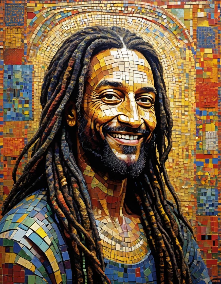A vibrant mosaic portrait of a smiling woman with dreadlocks, reminiscent of the Mona Lisa. The pointillist artwork features glowing highlights, warm golden tones, and intricate details.