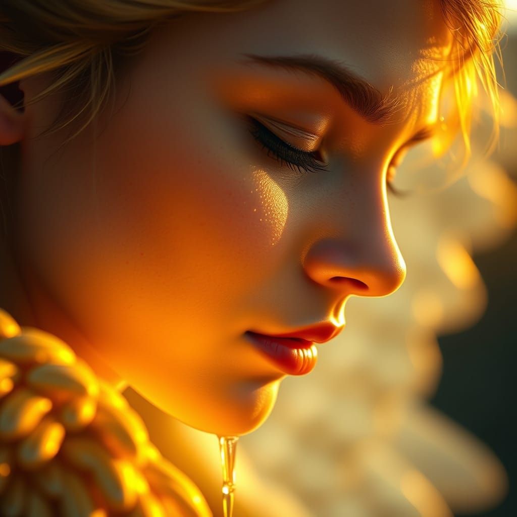 A serene angelic figure with closed eyes weeps molten gold tears. Golden wings rest against their head in soft, diffused light. The image has a dreamlike, painterly quality.