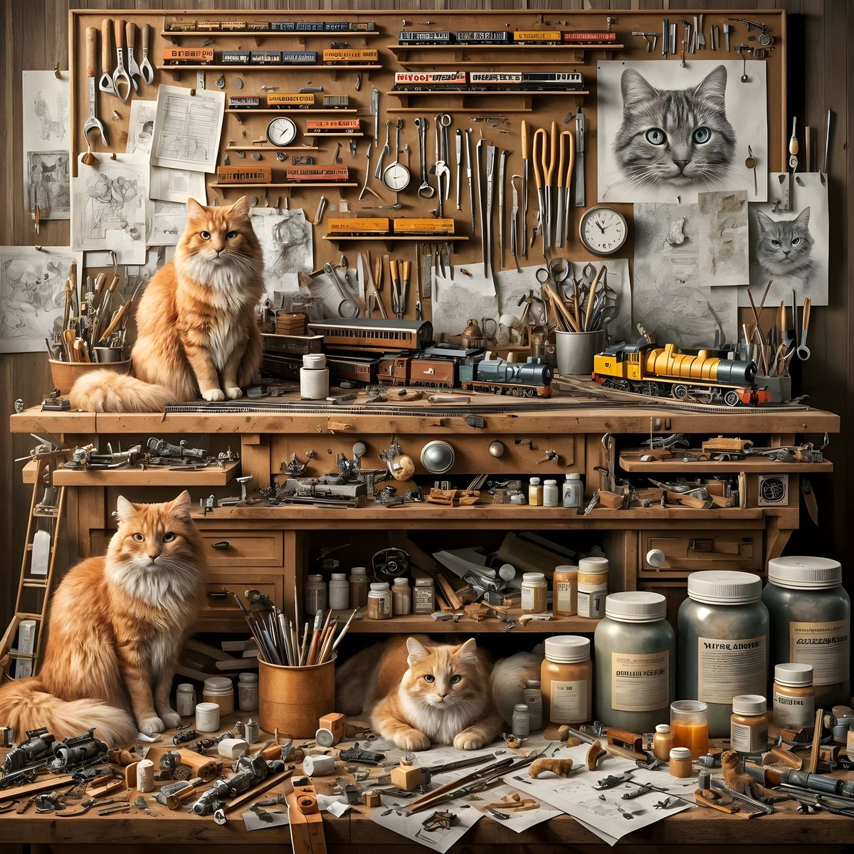 This image shows a detailed woodworking table scattered with model train parts, tools, and paperwork. Three cats, two orange and one tabby kitten, are resting among the items in a maximalist digital matte painting style.