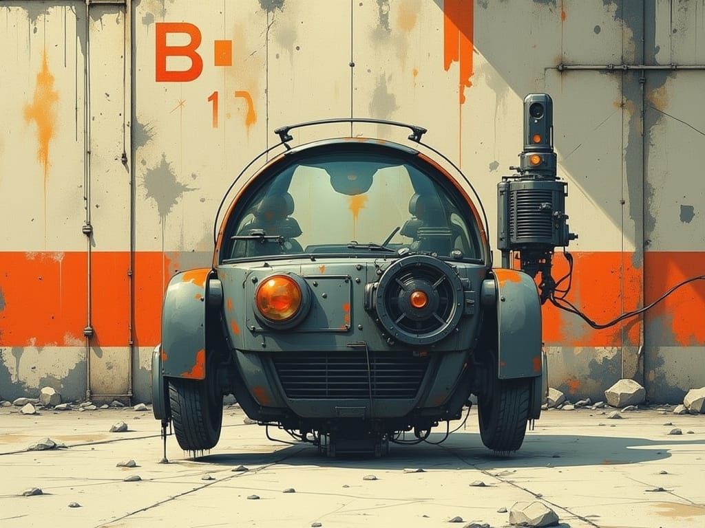 This image displays a grey steel, high-tech round watch with a metallic sheen, presented in a flat, cel-shaded style reminiscent of early anime. It's spotlighted against a striped wall, conveying a neo-futuristic, decaying atmosphere with muted colors and neon accents.