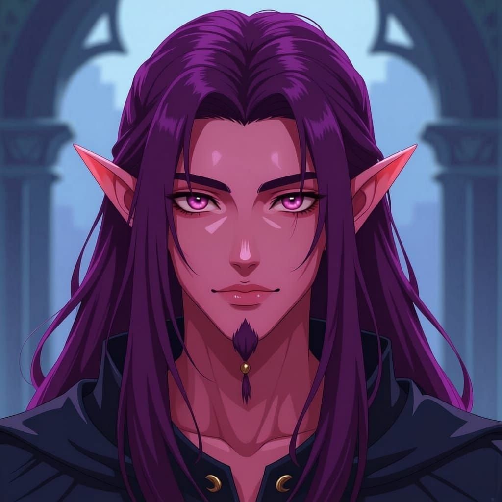 This image showcases a male elf character in an anime style, featuring dark pink skin, violet eyes, and long maroon hair.