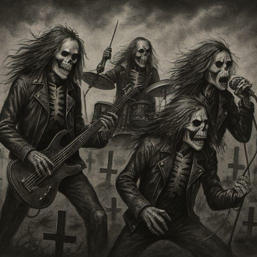 Create your own heavy metal skeleton band images with our free AI image generator. It's easy and fun!