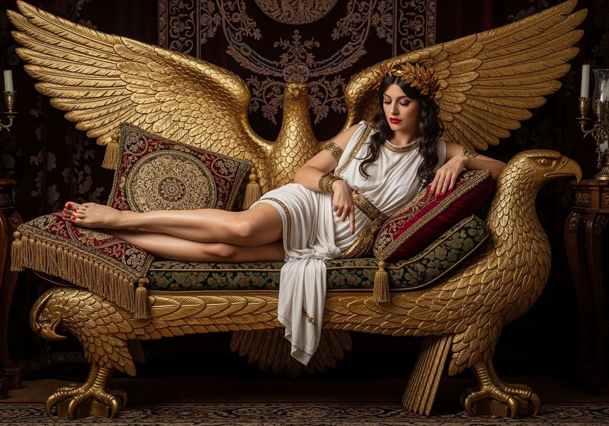 This image shows a Roman Empress relaxing on an ornate chaise lounge. The scene features opulent decor and is reminiscent of art nouveau with professional photography techniques.