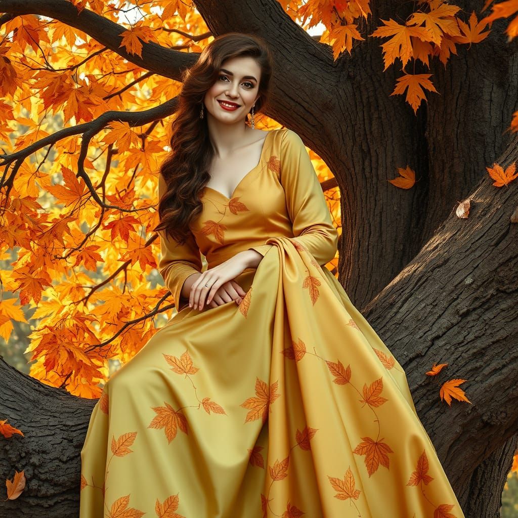 This image shows an elegant woman in a vibrant autumn forest, surrounded by colorful leaves and basking in warm golden light, reminiscent of Art Nouveau and Impressionist styles.