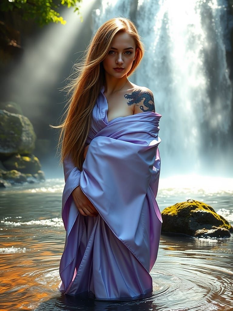 A woman in a kimono stands in a creek by a waterfall, sunlight creating a soft glow. This image evokes the art nouveau style with a dreamy and misty atmosphere.