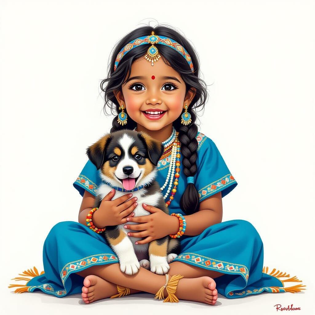 This image shows a young Indian girl with expressive eyes and a bright smile, holding a puppy. The portrait is reminiscent of classical Indian paintings, with vibrant colors and realistic details.