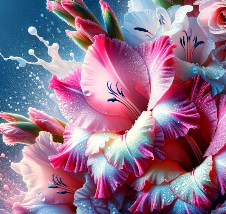 This image shows a stunning close-up of delicate pink and white gladiolus flowers, each petal glistening with dewdrops under soft blue light, reminiscent of a watercolour painting with a delicate border