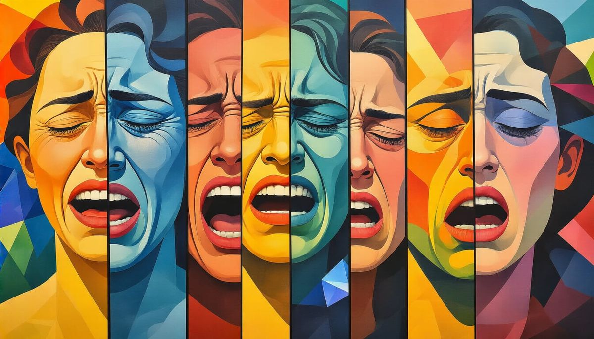 Collage of overlapping portrait panels displaying diverse emotions. Vibrant colours and scattered prisms create a dynamic, kaleidoscopic effect, inspired by Cubism and Delaunay's colour theories.