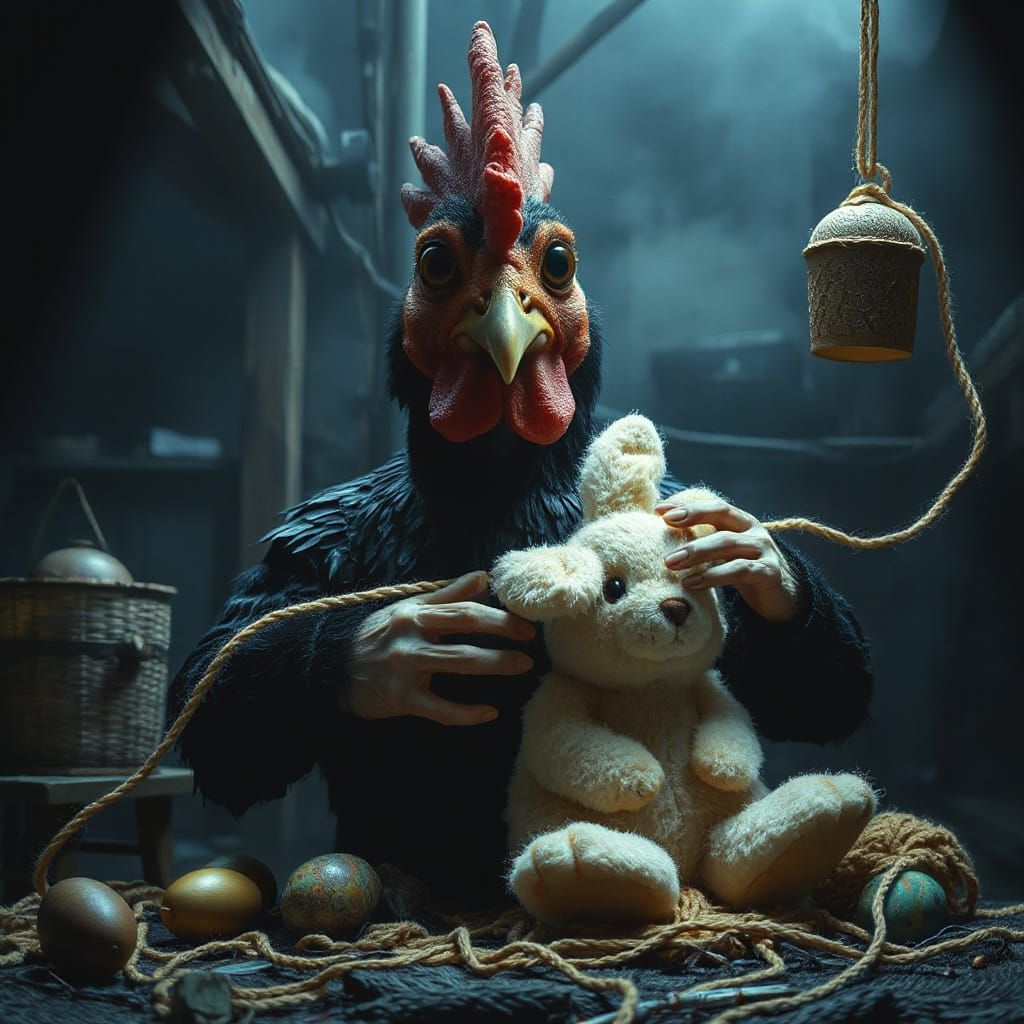 This image depicts a hauntingly beautiful scene of a gigantic, anthropomorphic Mad Chicken knitting an Easter Bunny, with warm fuzzies and soft threads spilling from its hands, amidst a swirling vortex of bold, pop surrealistic patterns and textures, evoking a sense of unnerving intensity and nostalgia