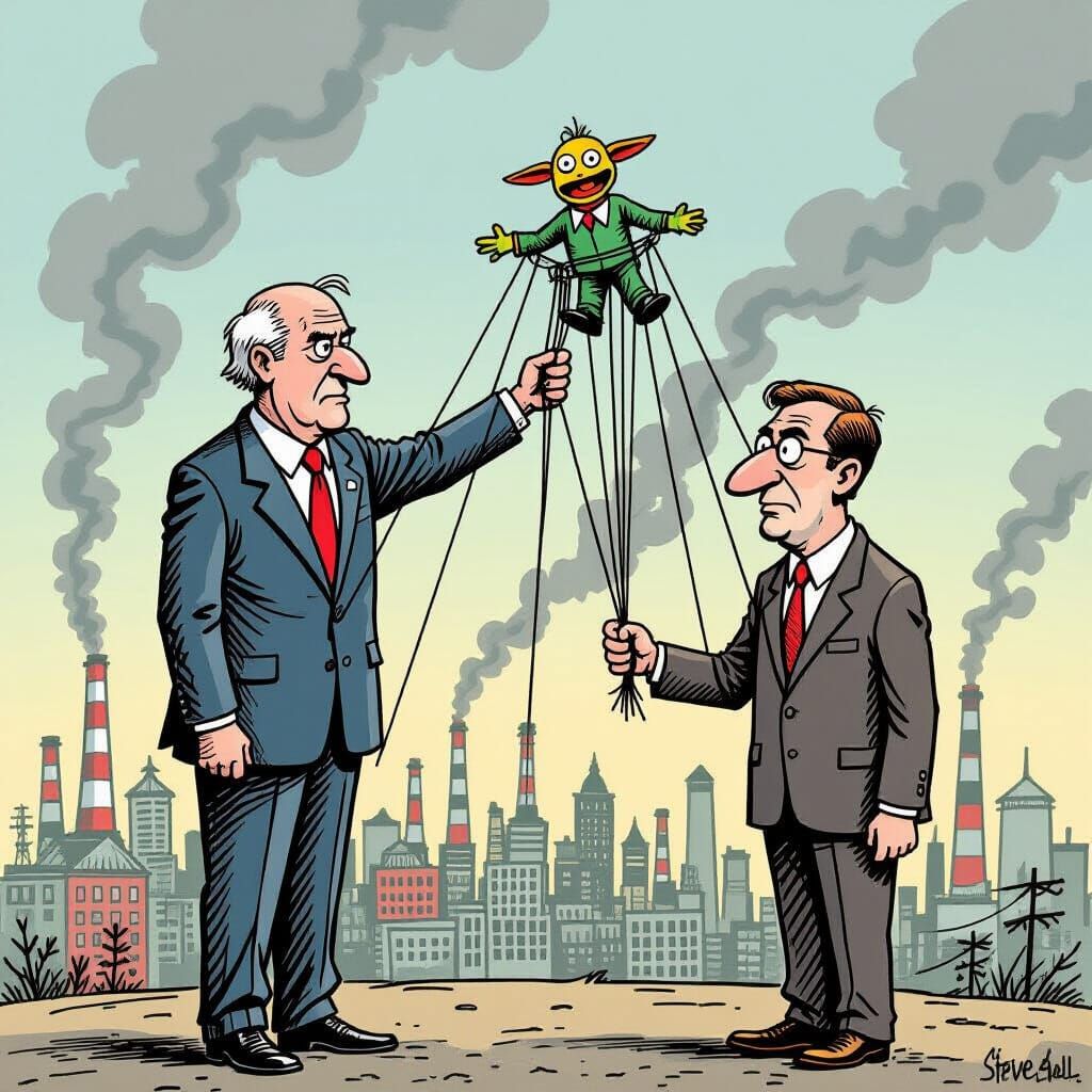 This image depicts a Republican figure manipulating an EPA official amidst a polluted industrial landscape. The cartoon uses bold lines and exaggerated features in a political art style.