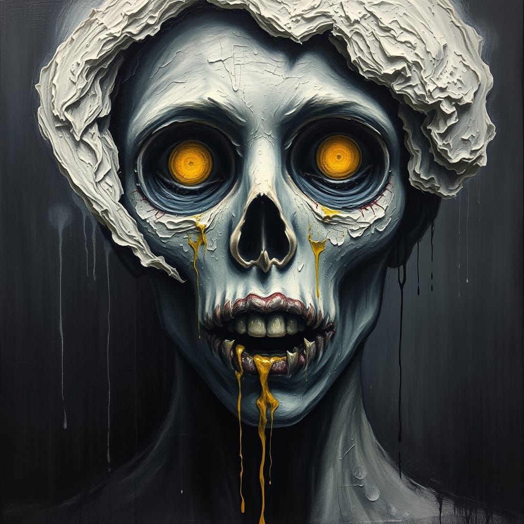 This image showcases a dark, surrealist portrait of a woman with empty eye sockets, rendered in a rough-textured oil painting style with thick, grainy impasto techniques.