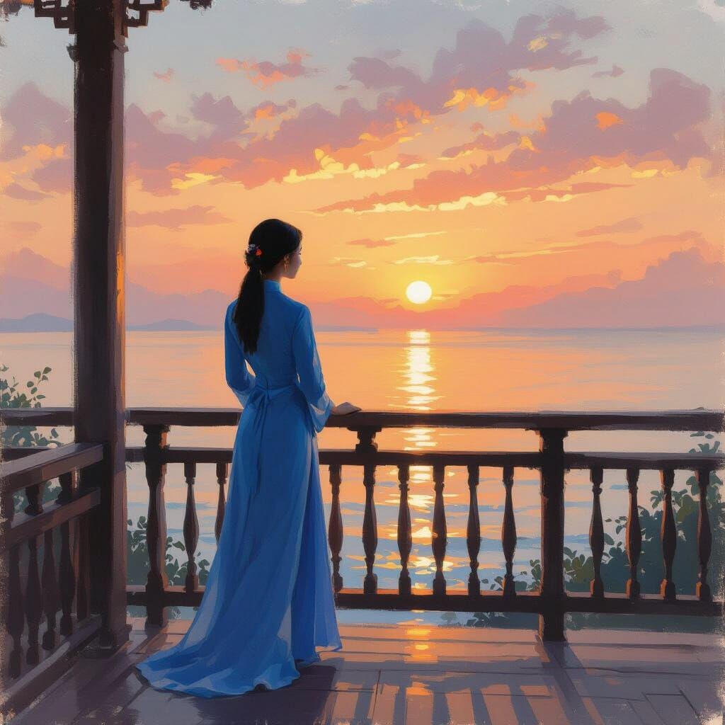 This image shows a woman in a blue ao dai on a wooden balcony, viewing a peaceful sunset over a calm ocean. Rendered in an impressionist oil painting style with a focus on light and color.