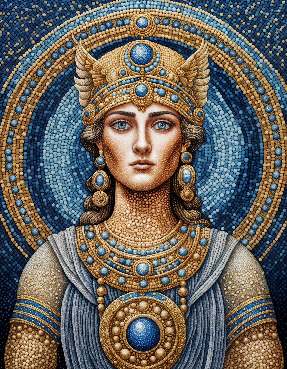 In this pointillism artwork, Athena is portrayed as the epitome of wisdom and strength. The intricate detailing in her helmet, robes, and the subtle glow around her creates an ethereal quality. Each dot represents a piece of her story, from her role in the Trojan War to her protection of ancient Athens. The use of rich, earthy tones brings out her divine essence, making this piece a tribute to her enduring mythology.