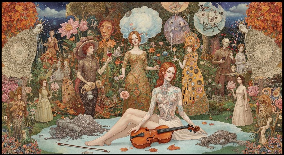 A vibrant digital collage showing a woman with a viola surrounded by nature, musical elements, and abstract designs. This artwork evokes themes of resilience and embracing change as surreal digital art.