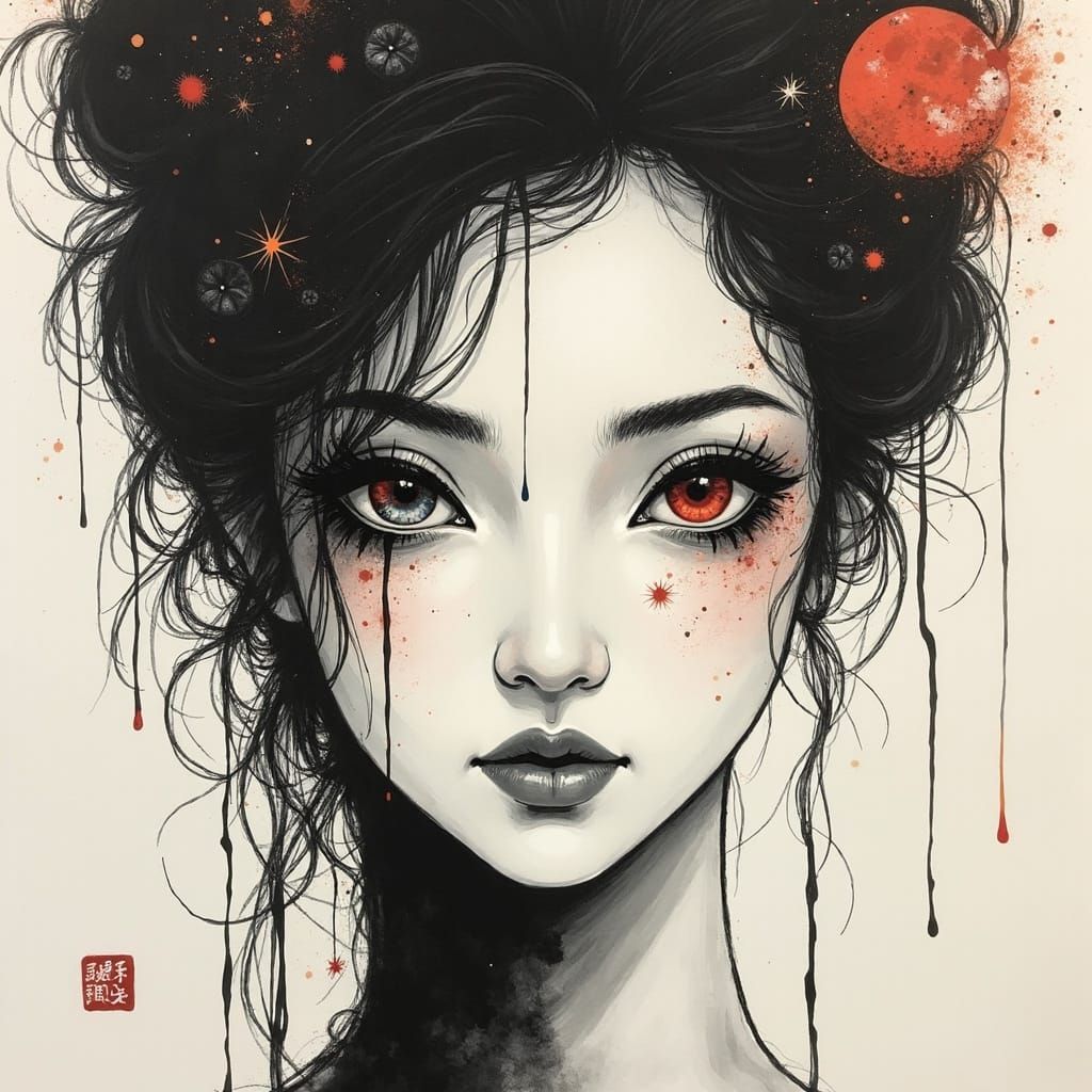This image shows a stunning portrait of a Chinese woman with the moon, sun, and stars depicted in her eyes, created in intricate Chinese ink dripping style.