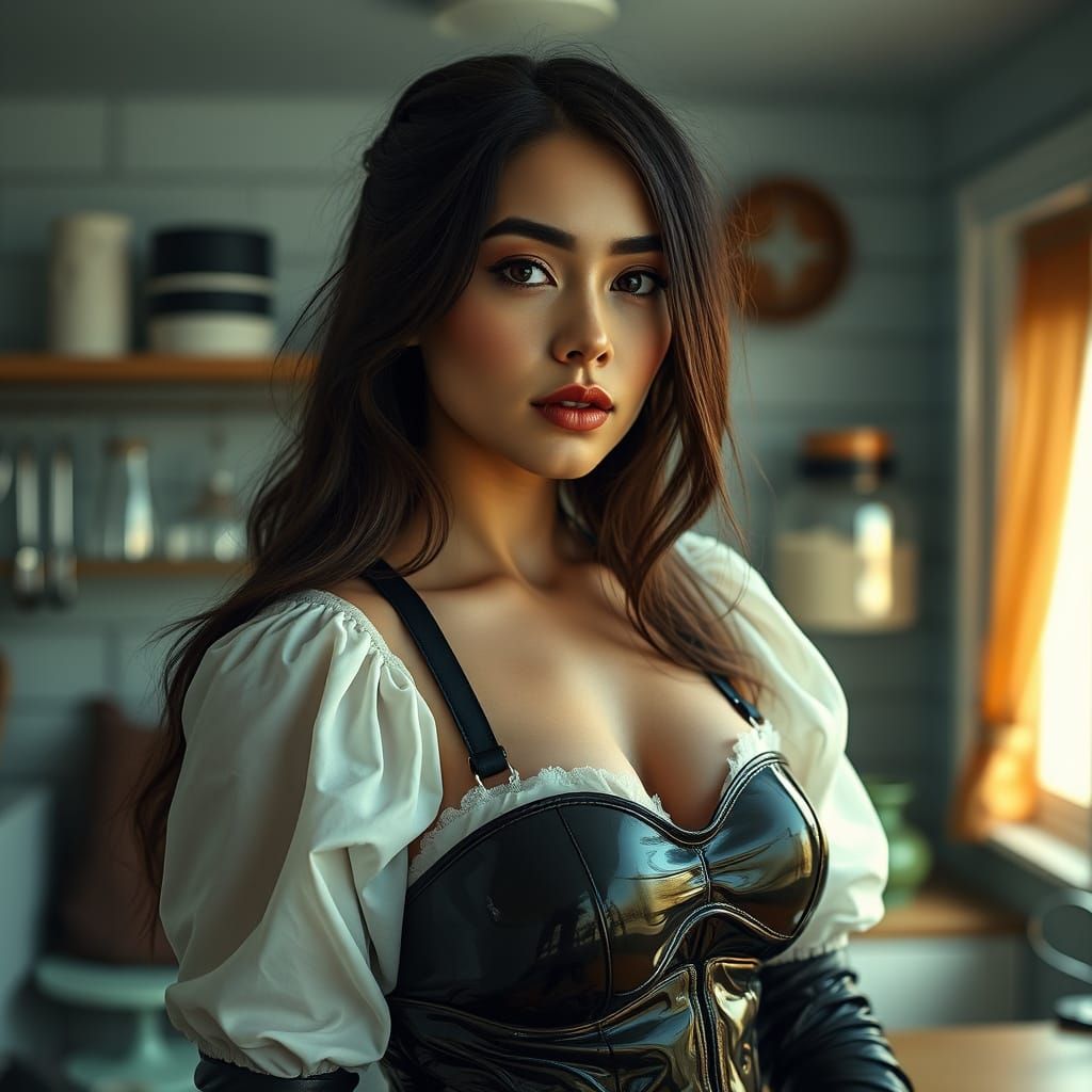 A hyperrealistic image of a beautiful young woman dressed as a maid. The panoramic view shows incredible detail, with a focus on the latex outfit.