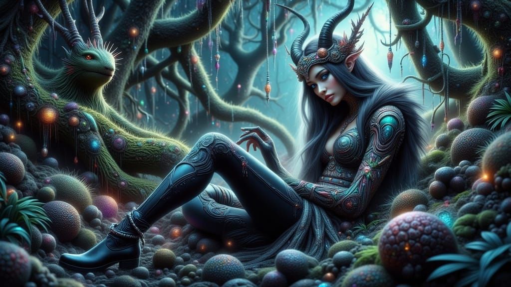 A striking image of a beautiful demon girl in a modern outfit, sitting in a magical forest. The scene features moonlight, dappled light, and deep shadows, rendered in a hyperrealistic cinematic art style with photorealistic textures.