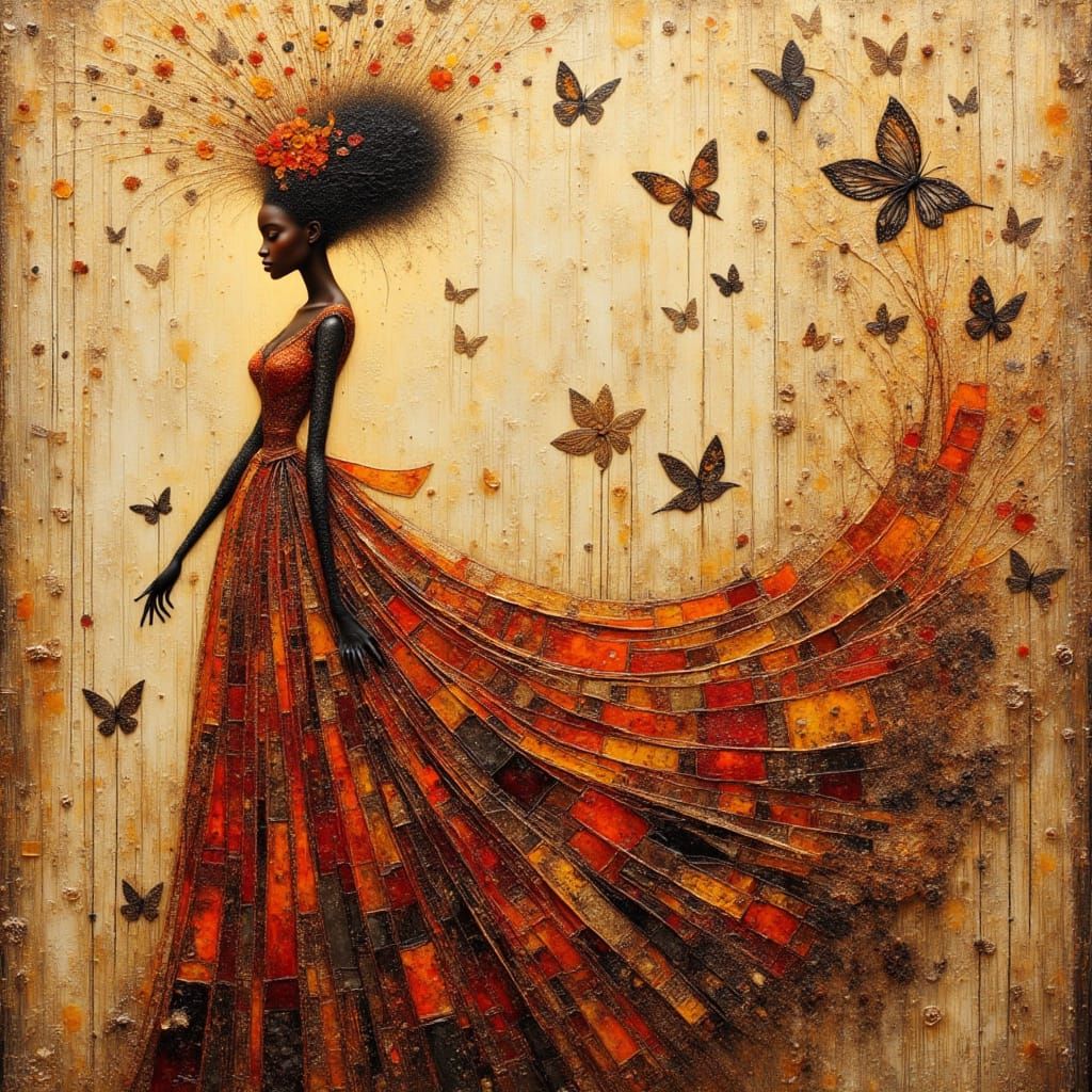 A striking picture of an African princess in silhouette. Her dress transforms into birds, set against a detailed backdrop. The artwork features encaustic and impasto techniques, with gold leaf accents.