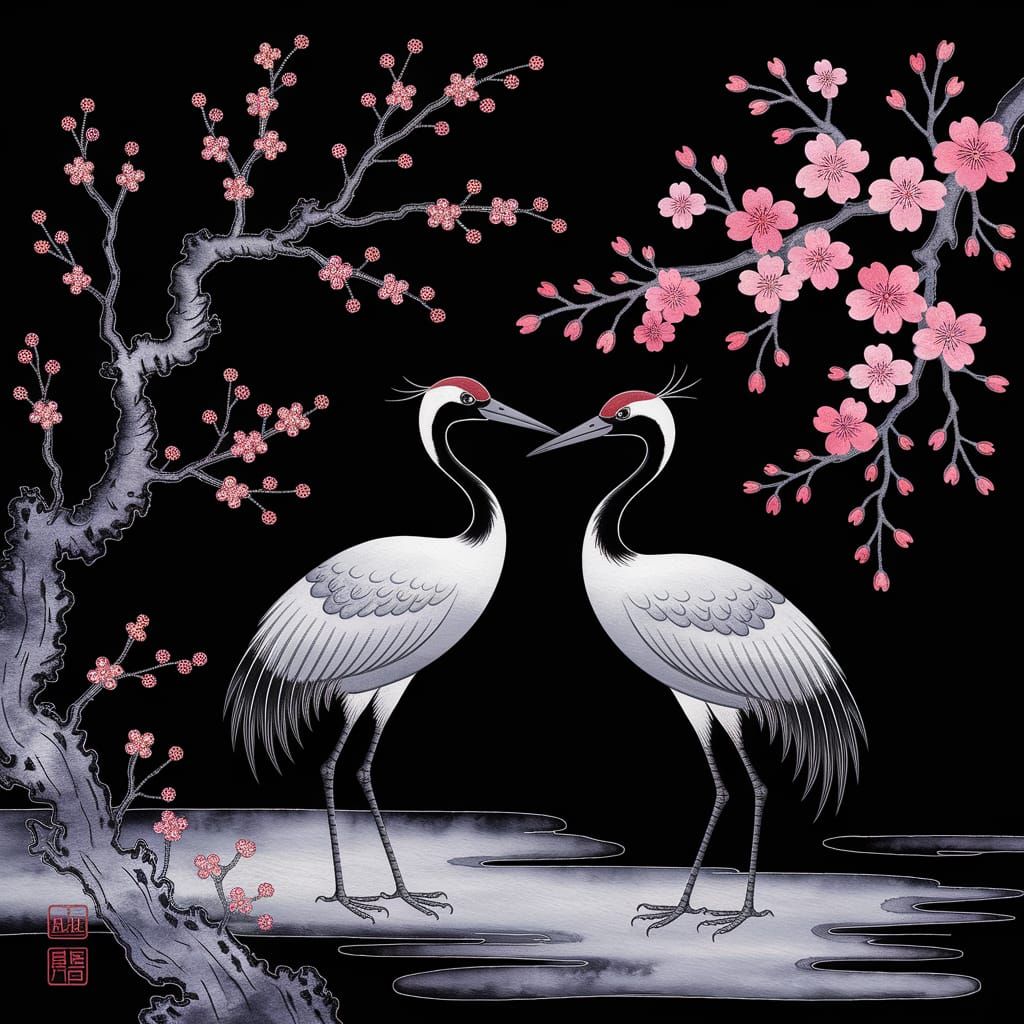 This image shows a serene Chinese landscape with two black cranes standing on a lakeshore, surrounded by falling cherry blossoms. The artwork is reminiscent of traditional Chinese painting techniques, with sfumato and watercolor effects.