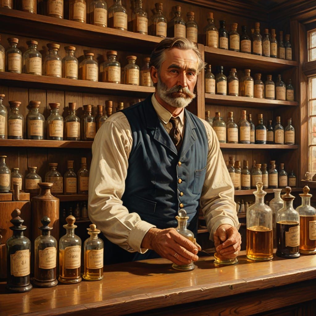 This image shows a vintage apothecary scene with a pharmacist behind a wooden counter. The oil painting style captures the warm light reflecting off dusty bottles in a classic, nostalgic, and ornate Victorian-era pharmacy.