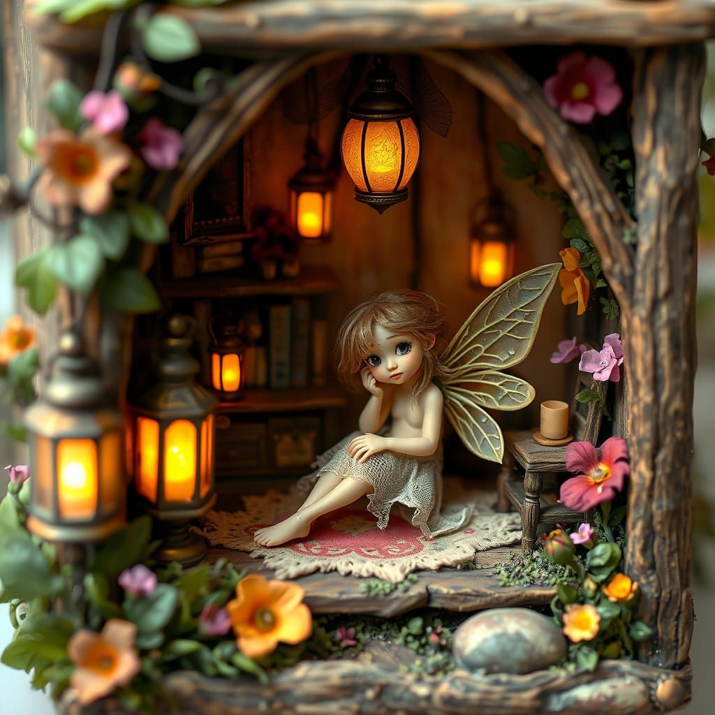 This image shows a fairy in a detailed fairy house interior. The room is illuminated by soft lanterns and filled with flowers and plants, rendered with warm colors and intricate details, in a whimsical style.