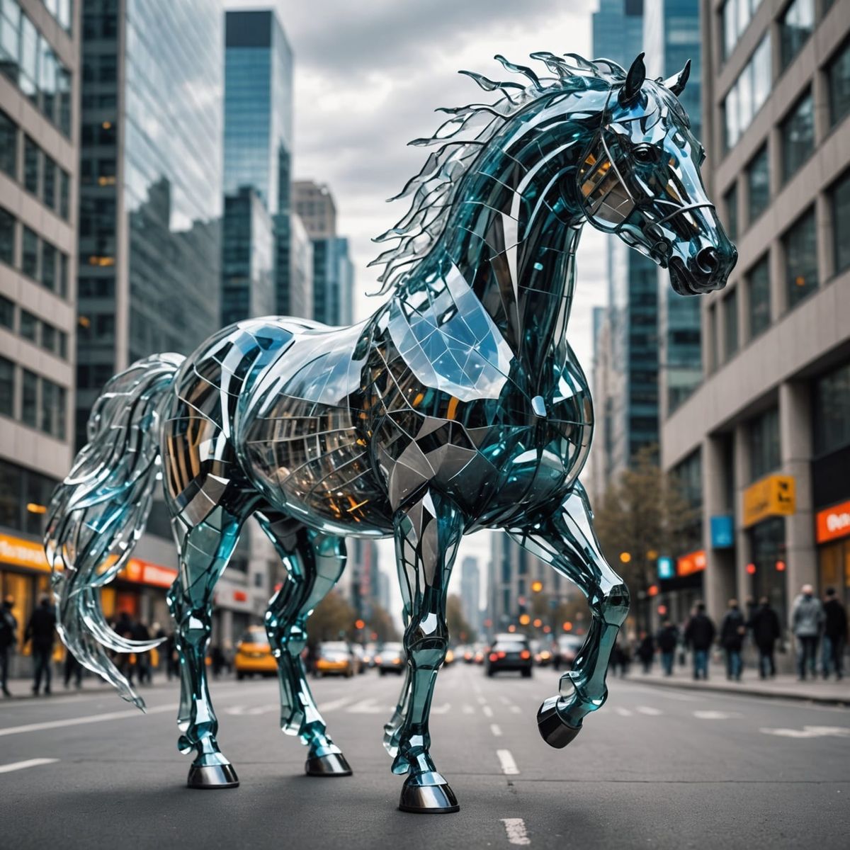 This image shows a macro shot of a transparent horse constructed from glass and metal, situated within a sprawling city. The cityscape features gleaming skyscrapers and intricate fractal designs.
