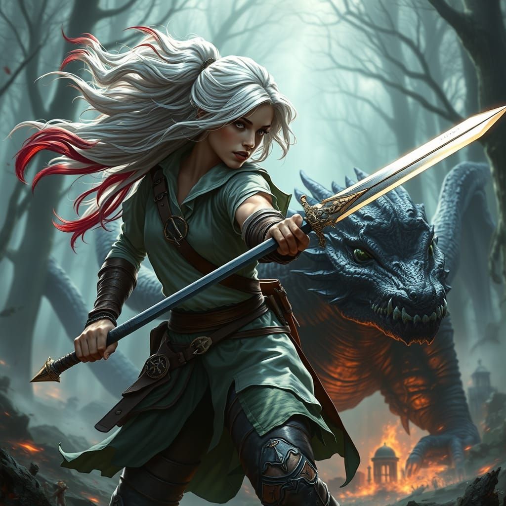 A striking picture of a female ranger battling an undead dragon in a foggy forest. She wears leather armor and wields a magical sword, all rendered as photorealistic concept art.