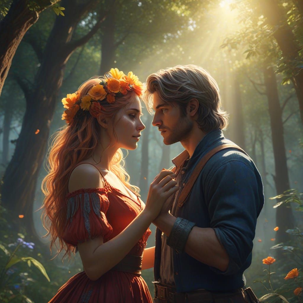 Fantasy concept art depicting a couple in a vibrant, magical forest clearing on National Boyfriend Day, featuring intricate details, complementary colors, and sunlight filtering through ancient trees.
